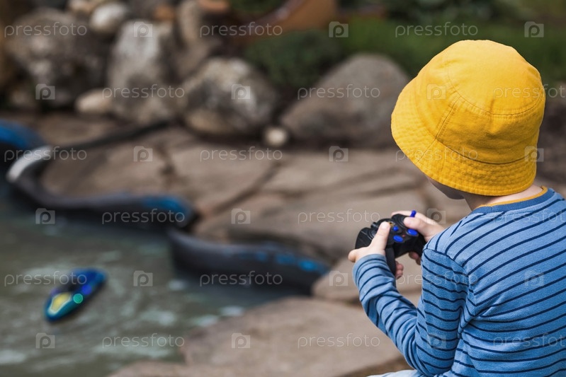 Пятилетний мальчик в желтой панамке спускает на воду радиоуправляемую лодку. Детские забавы и уличные игры. Детский досуг