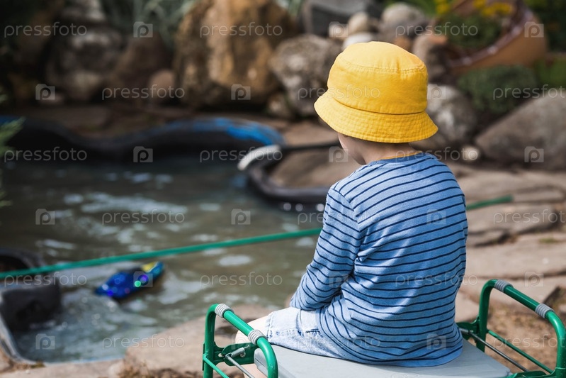 Пятилетний мальчик в желтой панамке спускает на воду радиоуправляемую лодку. Детские забавы и уличные игры. Детский досуг