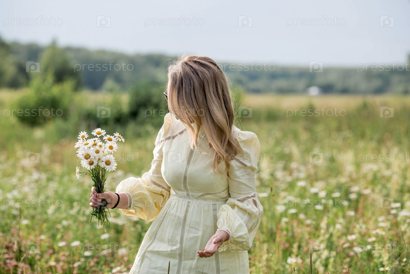 Портрет красивой белой женщины лет 30+ в желтом льняном платье в поле с букетом полевых ромашек