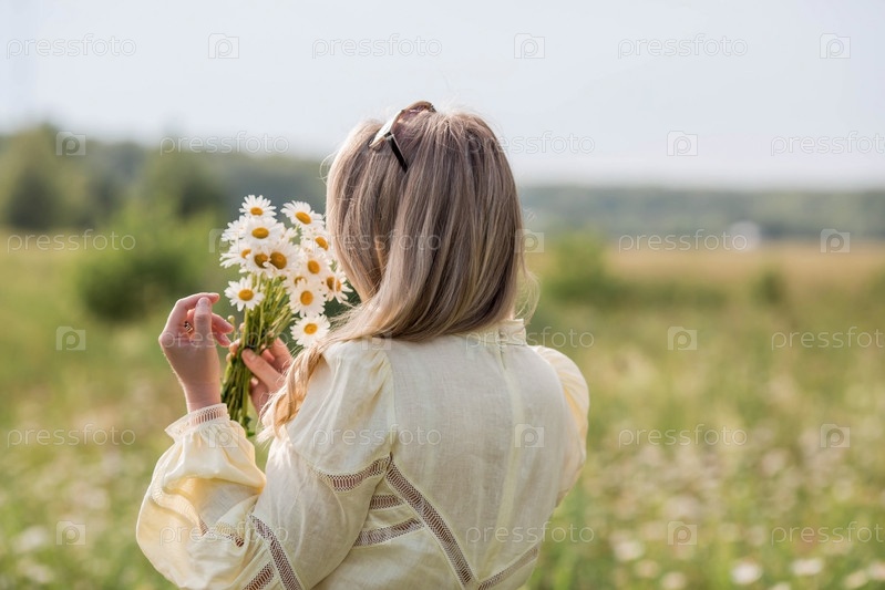 Портрет красивой белой женщины лет 30+ в желтом льняном платье в поле с букетом полевых ромашек