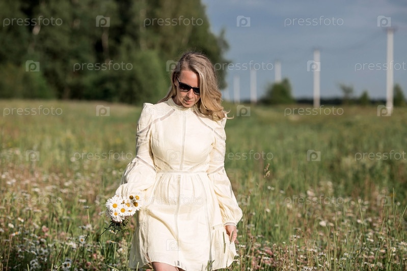 Портрет красивой белой женщины лет 30+ в желтом льняном платье в поле с букетом полевых ромашек