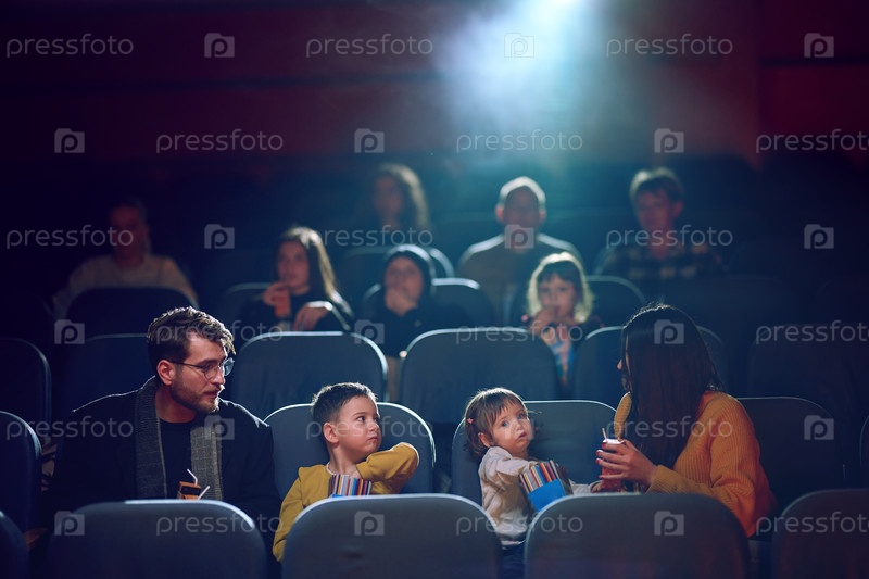 Современная семья приятно проводит время вместе в кинотеатре, наслаждаясь попкорном во время просмотра фильма со своими детьми
