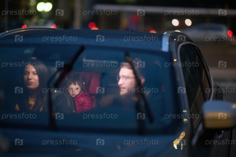 В ночные часы счастливая семья вместе наслаждается игровыми моментами в машине, путешествуя по ночной дороге, освещенной светом фар и наполненной смехом и радостью