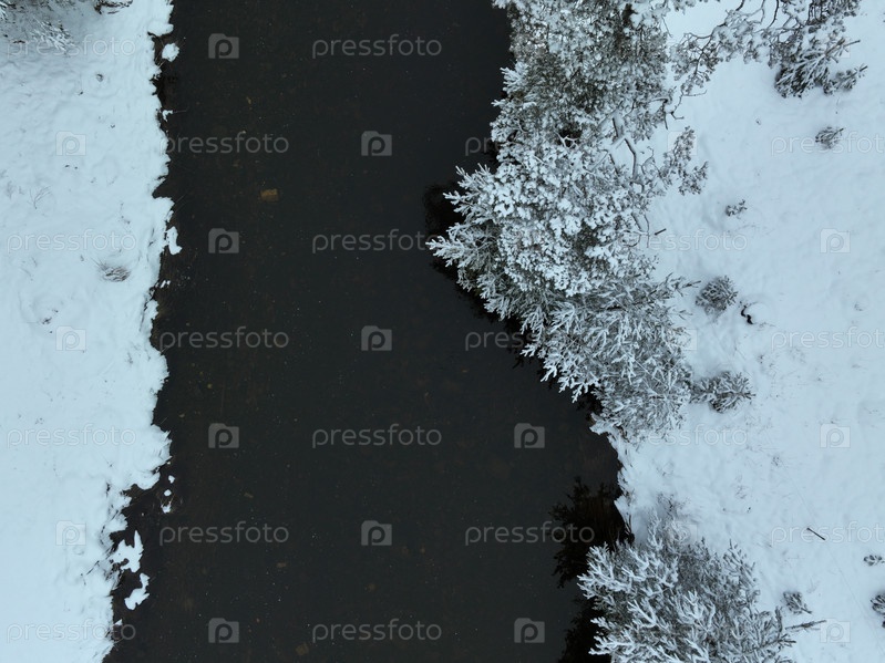Удивительный кинематографический вид с воздуха на замерзающую реку. Аэрофотоснимок полета над замерзшим ручьем, живописный вид на природу