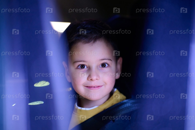 Маленький мальчик наслаждается поездкой на машине, запечатленной через окно, наблюдая за проезжающими пейзажами