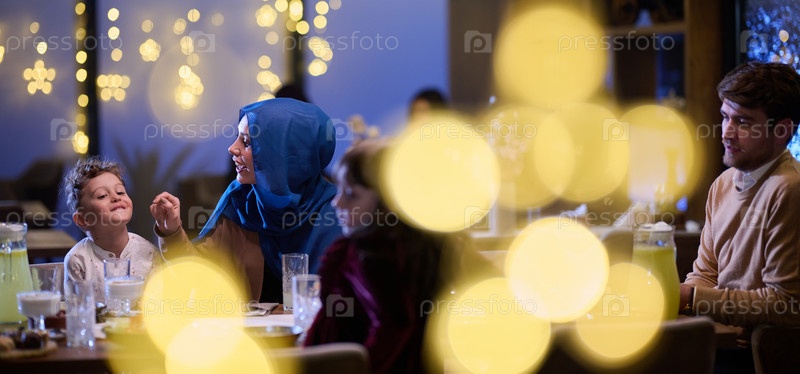 В современном ресторане исламская пара и их дети с радостью ожидают ифтара во время священного месяца Рамадан, олицетворяя семейную гармонию и культурный праздник в современной обеденной атмосфере