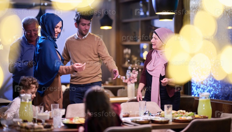 Бабушки и дедушки приходят на встречу своих детей и внуков на ифтар в ресторане во время священного месяца Рамадан, неся подарки и делясь заветными моментами любви, единения и культурного обмена, с нетерпением ожидая совместной трапезы