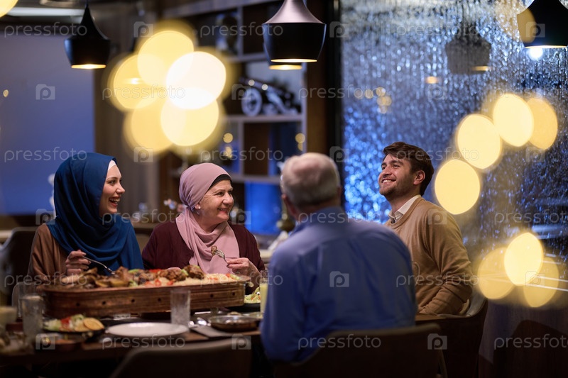 Современная и традиционная европейская исламская семья собирается вместе на ифтар в современном ресторане во время поста Рамадан, олицетворяя культурную гармонию и семейное единство среди кулинарного праздника разнообразия