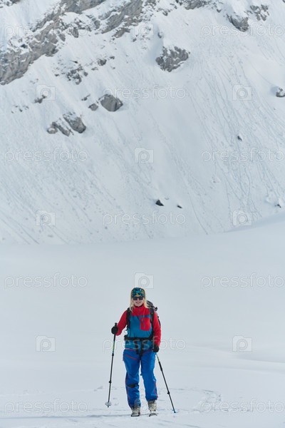 Женщина-альпинистка поднимается в Альпы со снаряжением для бэккантри