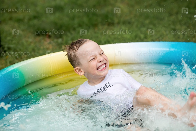 Сегодня жаркий день. Милый мальчик плавает и плещется в бассейне. Счастливый маленький мальчик улыбается в камеру. Брызги воды летят во все стороны. Концепция летнего отдыха с детьми