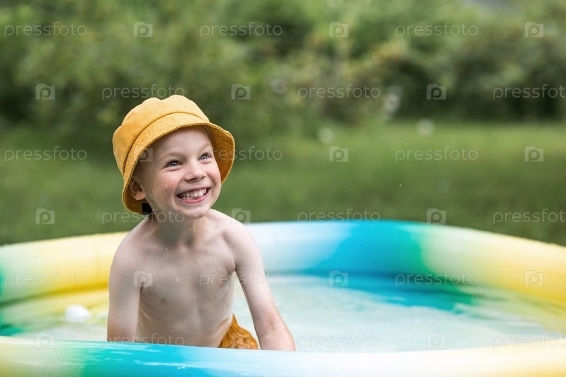 Сегодня жаркий день. Милый мальчик плавает и плещется в бассейне. Счастливый маленький мальчик улыбается в камеру. Брызги воды летят во все стороны. Концепция летнего отдыха с детьми