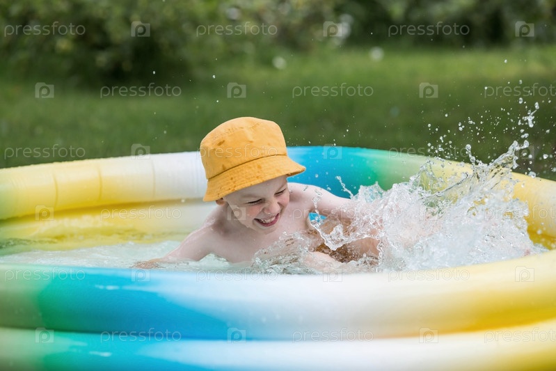 Сегодня жаркий день. Милый мальчик плавает и плещется в бассейне. Счастливый маленький мальчик улыбается в камеру. Брызги воды летят во все стороны. Концепция летнего отдыха с детьми