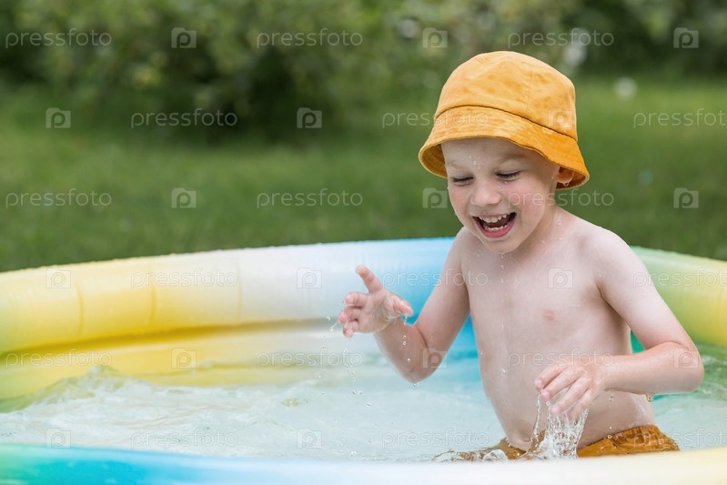 Сегодня жаркий день. Милый мальчик плавает и плещется в бассейне. Счастливый маленький мальчик улыбается в камеру. Брызги воды летят во все стороны. Концепция летнего отдыха с детьми