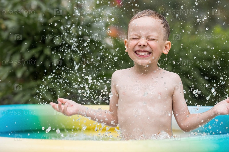 Сегодня жаркий день. Милый мальчик плавает и плещется в бассейне. Счастливый маленький мальчик улыбается в камеру. Брызги воды летят во все стороны. Концепция летнего отдыха с детьми