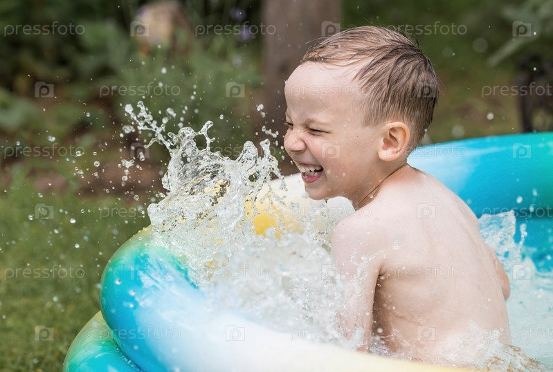 Сегодня жаркий день. Милый мальчик плавает и плещется в бассейне. Счастливый маленький мальчик улыбается в камеру. Брызги воды летят во все стороны. Концепция летнего отдыха с детьми