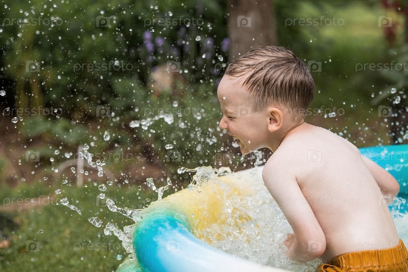 Сегодня жаркий день. Милый мальчик плавает и плещется в бассейне. Счастливый маленький мальчик улыбается в камеру. Брызги воды летят во все стороны. Концепция летнего отдыха с детьми