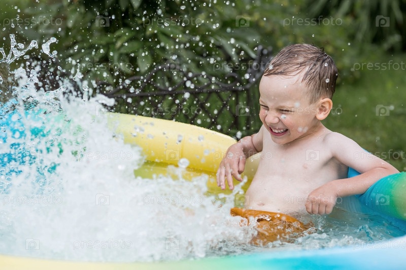 Сегодня жаркий день. Милый мальчик плавает и плещется в бассейне. Счастливый маленький мальчик улыбается в камеру. Брызги воды летят во все стороны. Концепция летнего отдыха с детьми