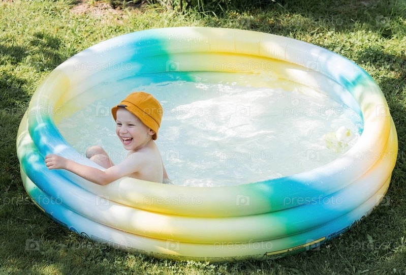 Сегодня жаркий день. Милый мальчик плавает и плещется в бассейне. Счастливый маленький мальчик улыбается в камеру. Брызги воды летят во все стороны. Концепция летнего отдыха с детьми
