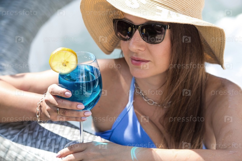 Концепция релаксации, спа и пенной вечеринки. Молодая женщина в купальнике и солнцезащитных очках в джакузи со стаканом коктейля «Голубая лагуна» и желтым лимоном на фоне бассейна