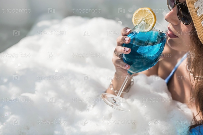 Концепция релаксации, спа и пенной вечеринки. Молодая женщина в купальнике и солнцезащитных очках в джакузи со стаканом коктейля «Голубая лагуна» и желтым лимоном на фоне бассейна
