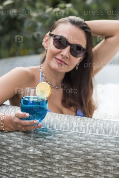 Концепция релаксации, спа и пенной вечеринки. Молодая женщина в купальнике и солнцезащитных очках в джакузи со стаканом коктейля «Голубая лагуна» и желтым лимоном на фоне бассейна