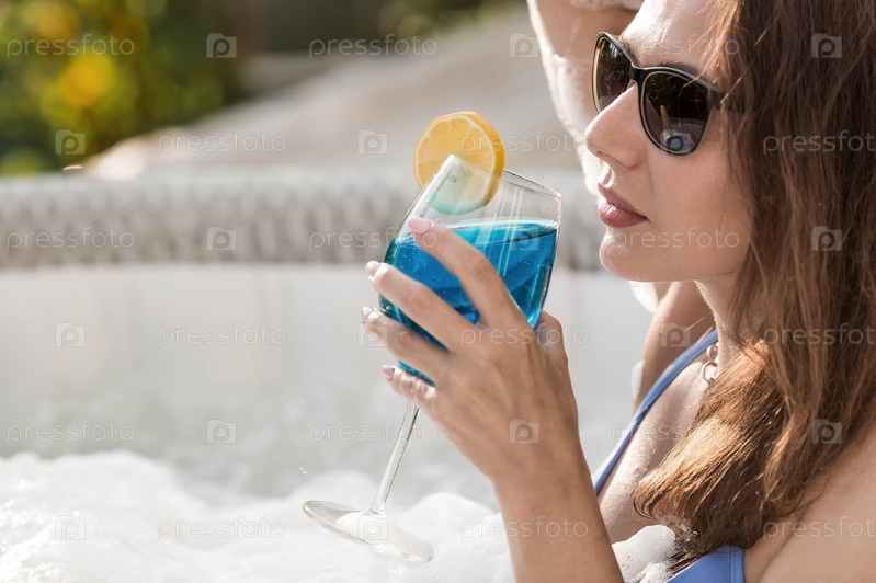 Концепция релаксации, спа и пенной вечеринки. Молодая женщина в купальнике и солнцезащитных очках в джакузи со стаканом коктейля «Голубая лагуна» и желтым лимоном на фоне бассейна