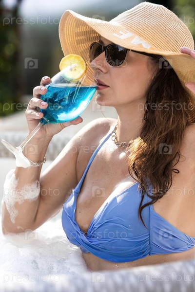 Концепция релаксации, спа и пенной вечеринки. Молодая женщина в купальнике и солнцезащитных очках в джакузи со стаканом коктейля «Голубая лагуна» и желтым лимоном на фоне бассейна