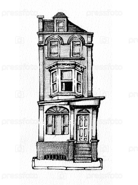 Винтажный дом на белом фоне, рисунок тушью