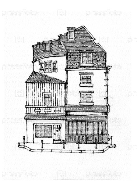 Винтажный дом на белом фоне, рисунок тушью