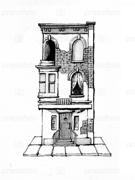 Винтажный дом на белом фоне, рисунок тушью