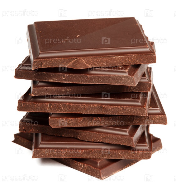 Стопка кусочков темного шоколада на белом фоне