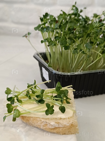 Бутерброд с маслом и микрозеленью на фоне лотка с растущей микрозеленью кольраби на завтрак