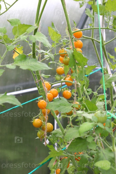 Куст со спелыми желтыми томатами черри в теплице