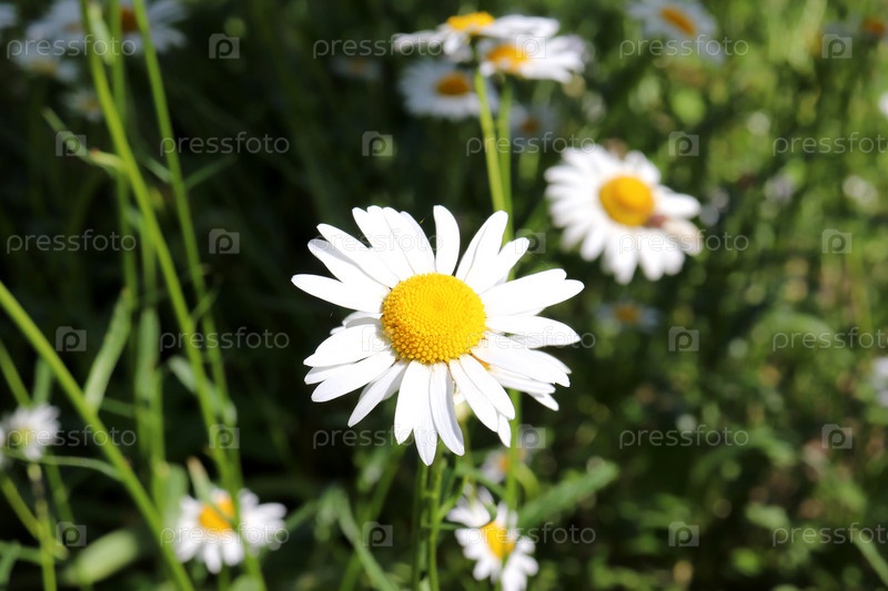 Ромашка на фоне других ромашек на лугу в солнечный день - крупный план