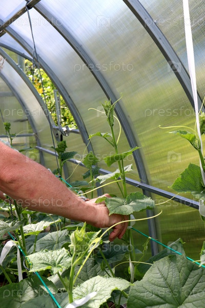 Мужчина подвязывает кусты с огурцами в теплице - руки, крупный план