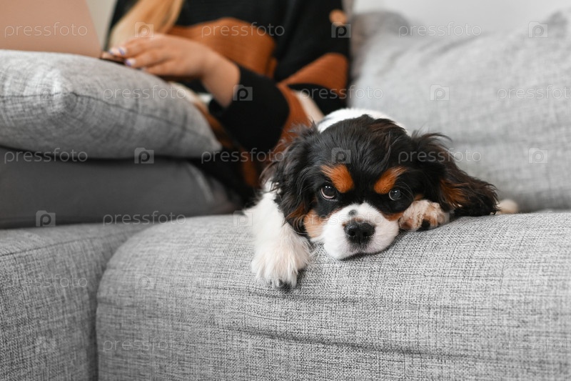 женщина сидит дома на диване перед ноутбуком со своим щенком кавалера Чарльза Кинг-спаниеля и работает онлайн