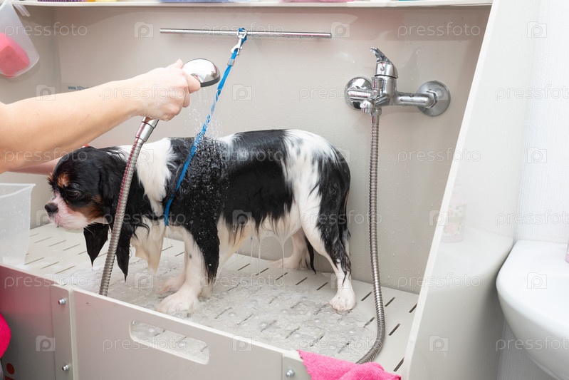 Забавный портрет кавалер-кинг-чарльз-спаниеля, принимающего душ с шампунем. собака принимает ванну с пеной в салоне по уходу за животными