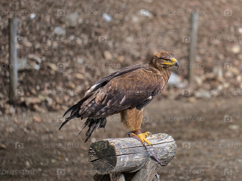 Орел сидит на деревянной опоре на улице