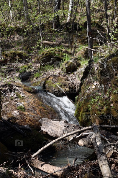 Лесная чаща с упавшими деревьями и ручьем среди покрытых мхом камней