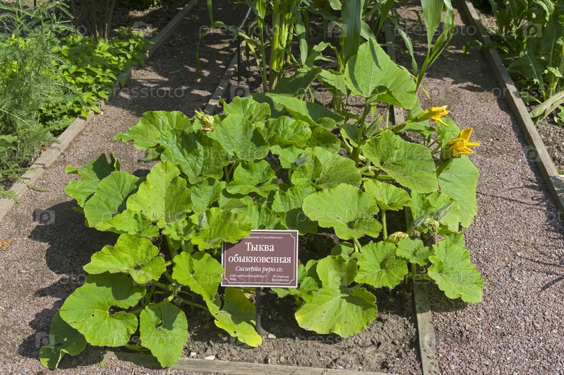 Цветящая тыква (лат. Cucurbita pepo) на кровати с лекарственными растениями в Аптекарском саду (филиал ботанического сада МГУ).Москва.Июль, солнечный