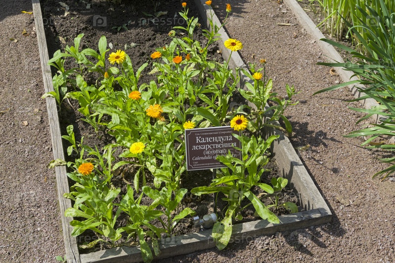 Цветящая лекарственная календула (лат. Calendula officinalis) на колыбели с лечебными растениями в Аптекарском огороде (филиал ботанического сада МГУ). Москва. июль, солнечный