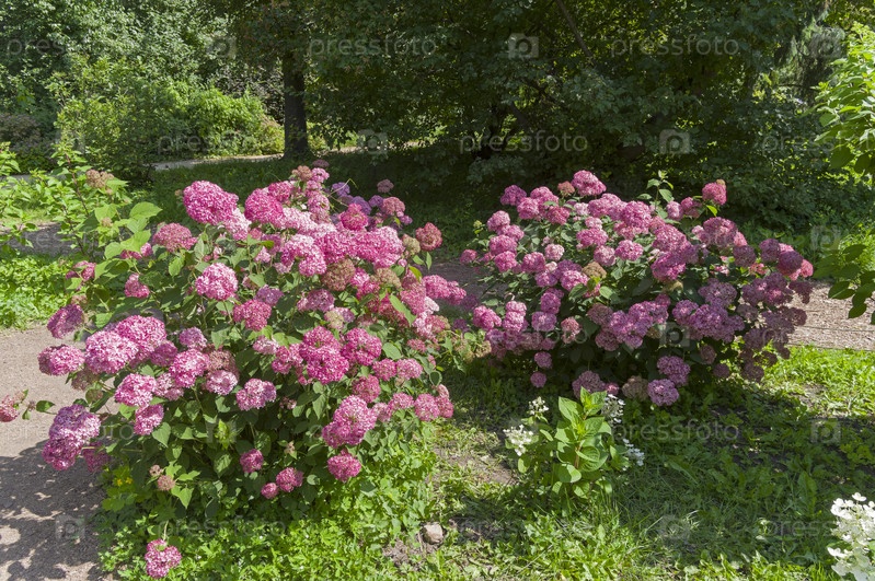 Цветущая розовая гиртензия сорта Annabelle (лат. Hydrangea arborescens) в Аптекарском саду (филиал ботанического сада МГУ). Москва. июль, солнечный