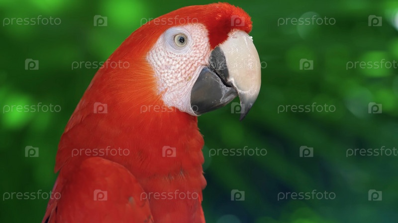 Яркий красный попугай с ярким оперением и большим изогнутым клювом сидит в пышной зелени