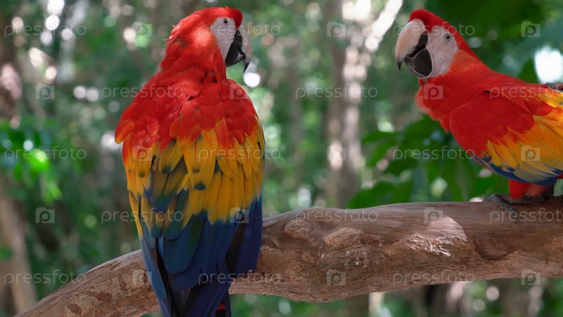 Два ярких попугая, украшенные яркими красными, желтыми и синими перьями, сидят на ветке дерева в пышном тропическом лесу