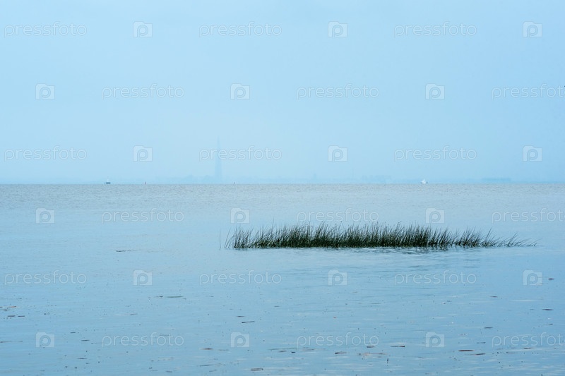 Туманный морской пейзаж, природный фон, вид на Финский залив в дождливую погоду