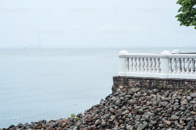 Старинная белая балюстрада на каменной стене на берегу моря