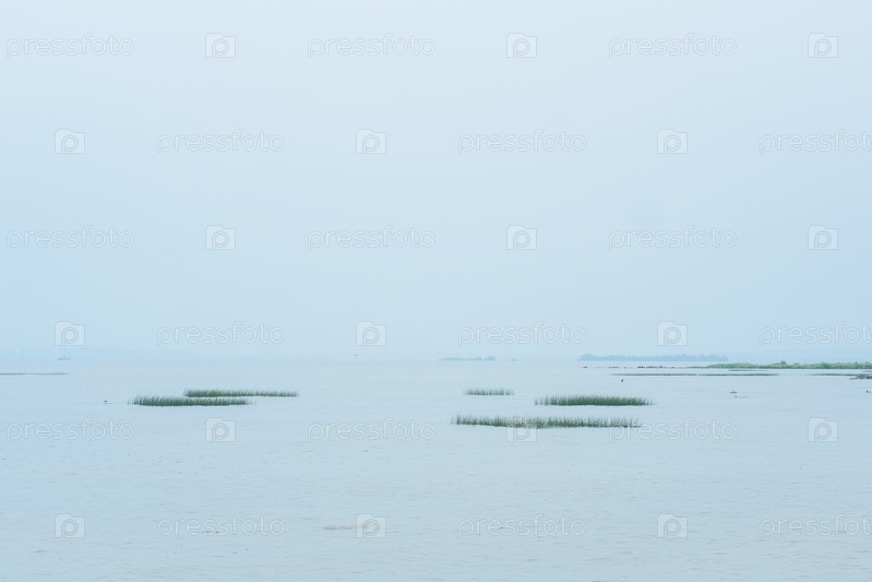 Туманный морской пейзаж, природный фон, вид на Финский залив в дождливую погоду