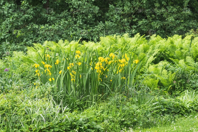 Желтые ирисы и папоротники на лужайке ландшафтного парка