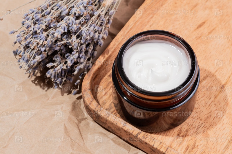 Крупный план коллагенового крема в открытой стеклянной банке и сухой букет лаванды на бежевом фоне. косметические средства по уходу за кожей и телом