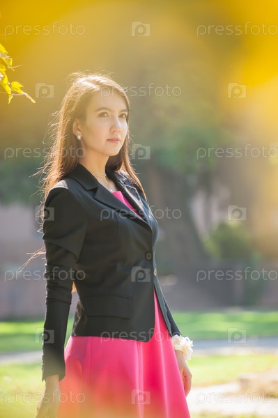 Молодая девушка азиатской национальности в красном платье на природе, портрет женщины